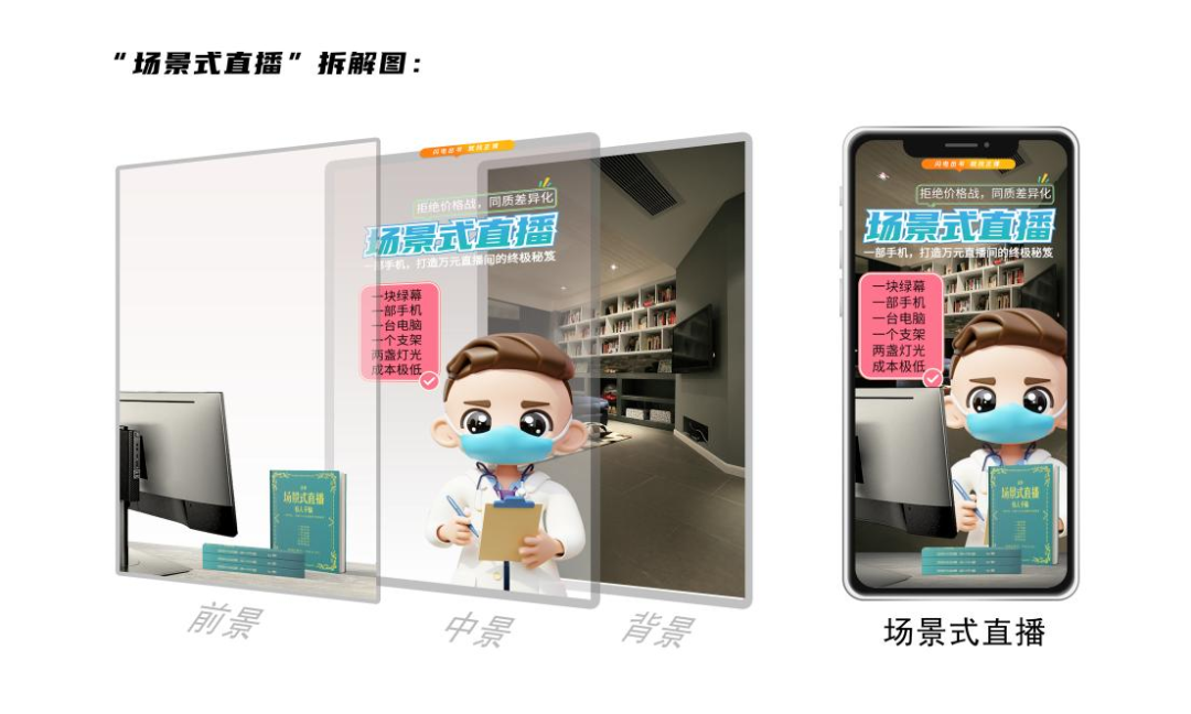 一场好的“场景直播间”,是通过将吸睛对象放置在前景、中景和背景中实现的,这是一项技术……